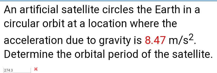 An artificial satellite circles earth in a circular orbit at a location where the acceleration due to gravity is 9 00 m s2. An artificial satellite is moving in a satellites ersfield satellite moving around the earth satellites and ion types an artificial satellite is revolving around a pla of m and radius r in circular orbit studyrankerssatellites ersfieldan artificial satellite is moving in a circular orbit of radius 42250 km calculate its sd if it takes 24. Determine the orbital period of the satellite. An artificial satellite circles the earth in a circular orbit at a location where the acceleration due to gravity is 6 83 m s2.